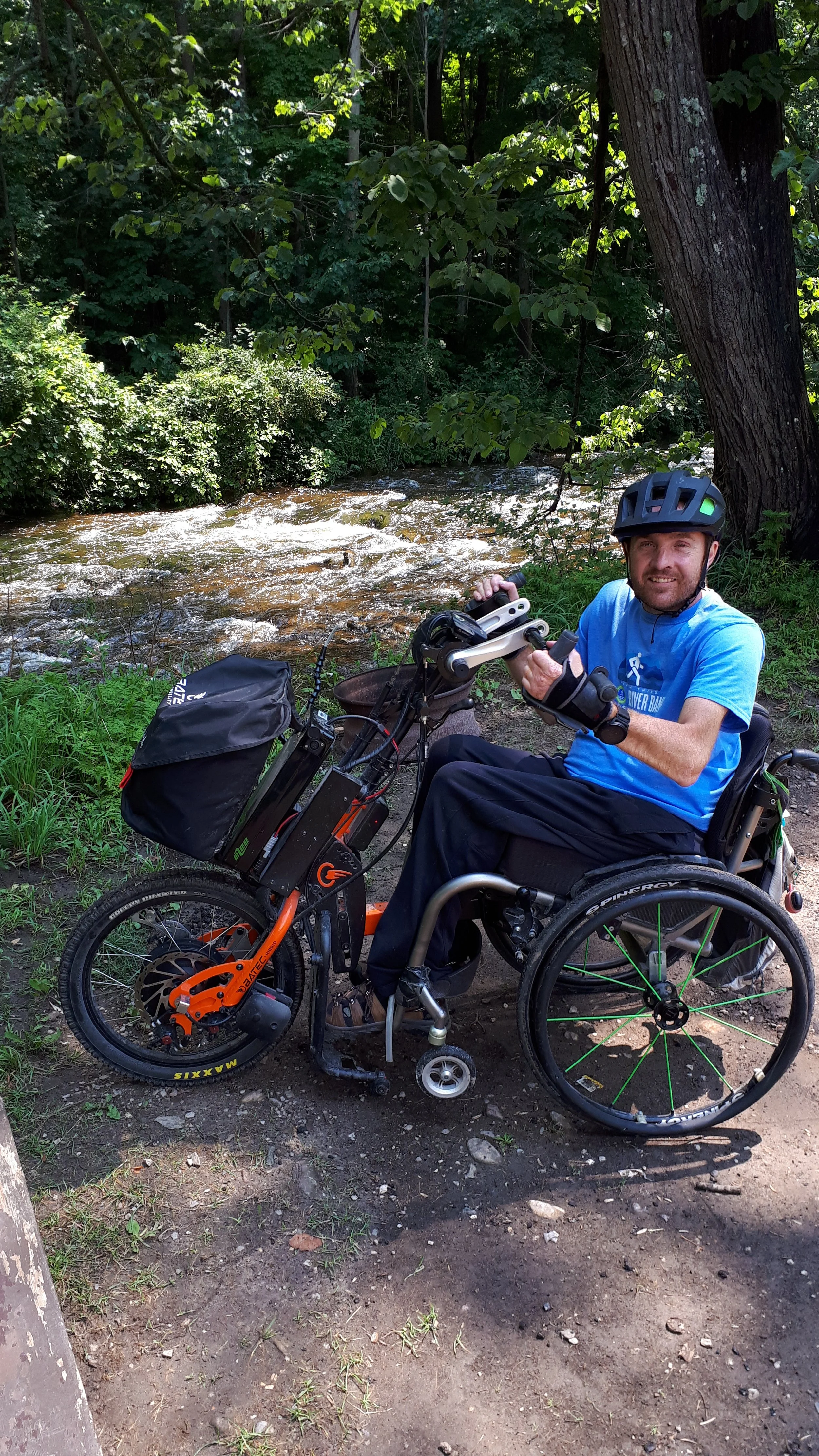 Hand cycling opened a whole new world for me. I always wanted to handcycle across Canada but it wasn’t physically possible. With limited hand and arm function and no triceps, I was slow compared to other cyclists. Hills were really difficult and I would often climb them at 2 km/hr. I would never get over the mountains and it would take way too long. Maybe I could do it in stages over a few years? It just didn’t seem possible. In 2018 I purchased a Batec power assist hand cycle which attaches directly to my wheelchair. It helped me get up hills and made me faster but it still required me to be cranking to move. I could attach and detach independently so I was not relying on other people to be able to outside to cycle. It was an amazing exercise and I could bike with my 8-year-old son. Another world opened up. It was perfect. I was able to cycle every day, which I did.